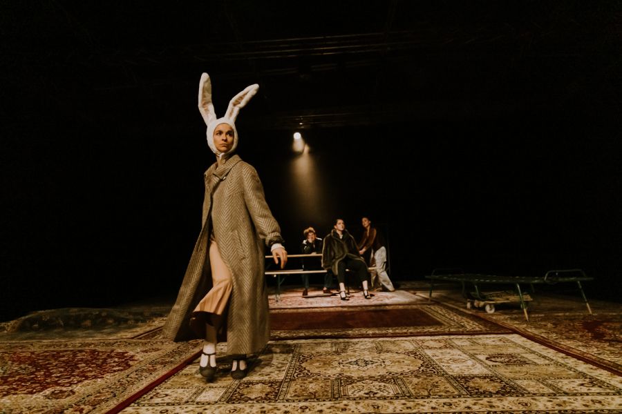 Daddy Shot My Rabbit is dedicated to bleeding souls and trembling bunnies. Equipped with furs and weapons, a community tries to survive alone. Unable to be close to each other, yet dependent on one another, four dancers stand in a dysfunctional network of relationships. Their traumatized coexistence manifests itself in their tense and restless bodies. In an atmosphere of latent violence, opaque actions testify to dissociative behavior. The cause of their suffering, which is to be guessed, only takes shape through the appearance of a rabbit. Shaking and twerking, they try to free themselves from the pressure of post-traumatic stress in order to finally be able to hold the past in their arms and caress it.